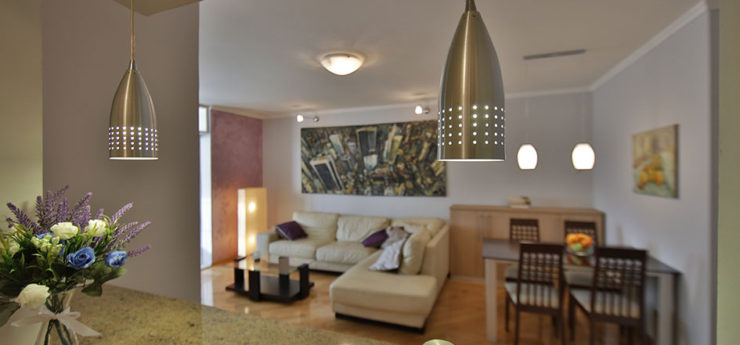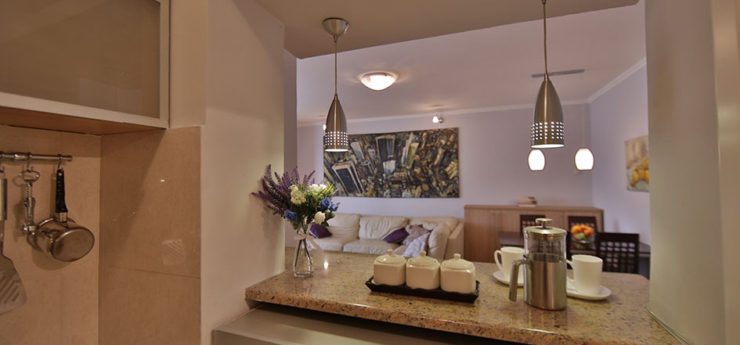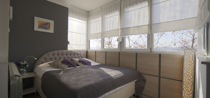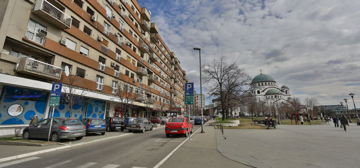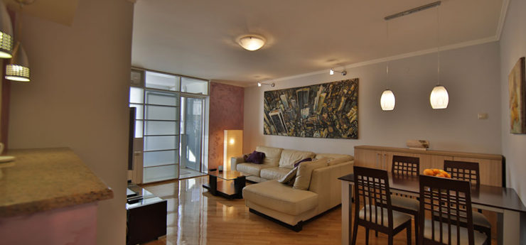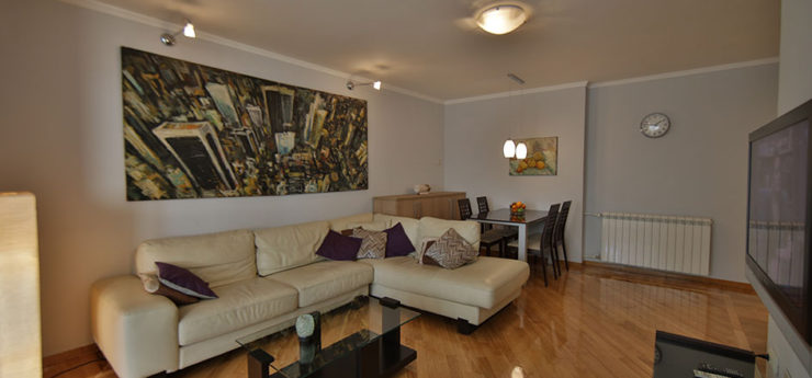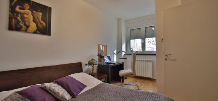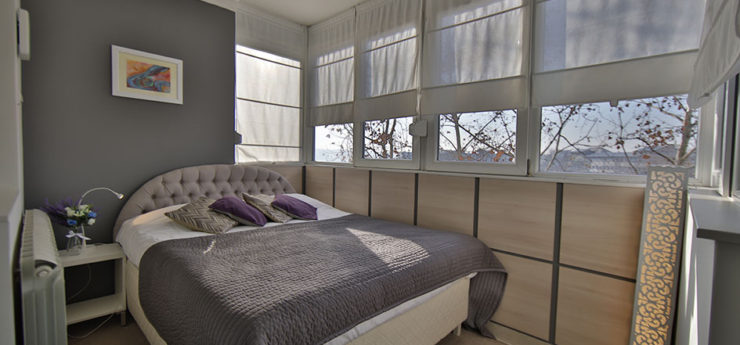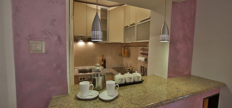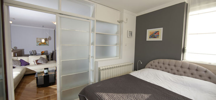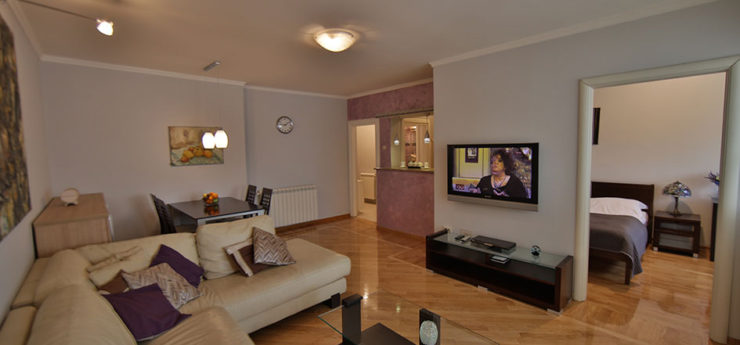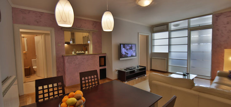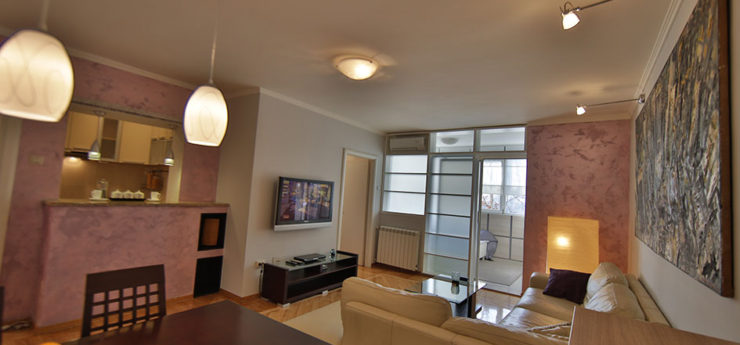 Apartman se nalazi u Krušedolskoj ulici, pored Hrama Svetog Save, sa pogeldom na Svetosavski plato. Površine je 58m²,  poseduje veliki dnevni boravak, kuhinju, terasu i dve spavaće sobe. Može da primi do četiri gosta, a oba kreveta su bračna. Stan poseduje svu opremu na koju su navikli gosti Sky Apartmana, kao što su rerna, mikrotalasna, mašine za veš i sudove. Gostima je na raspologanju i veliki broj uređaja za rad i zabavu – veliki LED TV, DVD, čak i laptop. TV je povezan na kablovsku televiziju, a u apartmanu je obezbeđen Wi-Fi. Stan se nalazi na petom spratu, u zgradi sa liftom. Nameštaj je klasičnog, funkcionalnog dizajna, dok su površine u braon, oker i roze tonovima.
