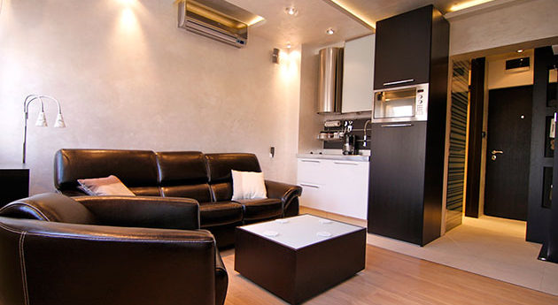 Drugi razlog zašto boravak u ovom apartmanu jeste luksuz leži u načinu na koji je apartman uređen. Dominiraju zagasite boje, drvo i koža, dok je spavaća soba jedna od naših najboljih u konkurenciji preko 50 apartmana, sa bračnim krevetom vrhuskog kvaliteta. Kupatilske elemente i pločice potpisuju najpoznatiji evropski proizvođači, dok je grejanje centralno, tako da ste lišeni i te brige. Za trenutke odmora tu su veliki TV sa kablovskim kanalima i obavezna bežična mreža, dok je kuhinja opremljena tako da može potpuno da odgovori na potrebe četvoro gostiju. Ipak , ovaj aprtman najbolje je koristiti kada dolazite sami ili sa još jednom osobom, jer nije projektovan za maksimalni kapacitet, kao naši apartmani koje preporučujemo mladim gostima iz inostranstva koji dolaze u grupama, već je projektovan, kao što mu i ime kaže – za maksimalan luksuz.