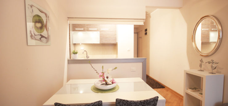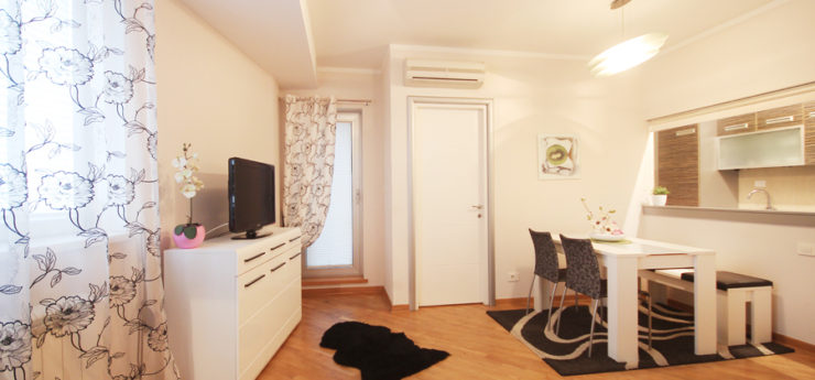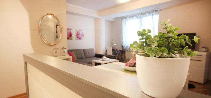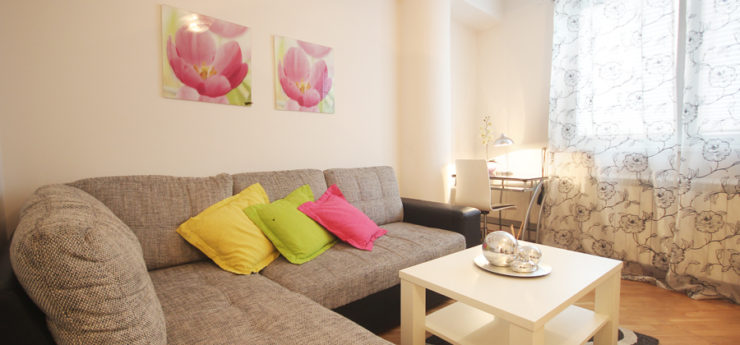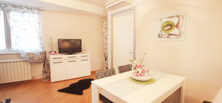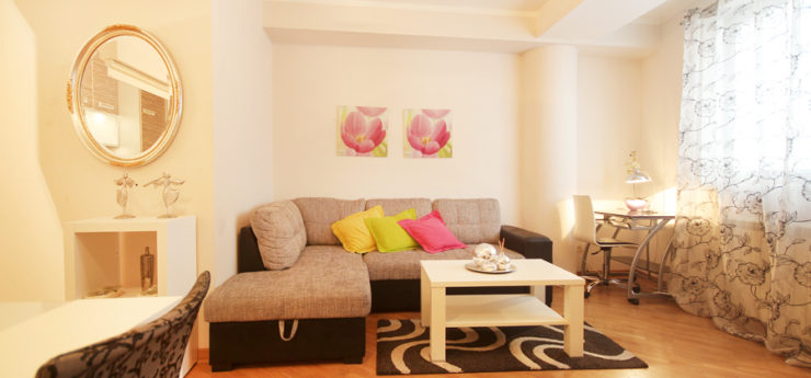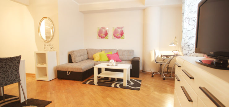 The main advantage of this Belgrade apartment is its suitability for smaller number of visitors, ideally 1-4. Standard Belgrade apartment has one bedroom with double bed, a large living room with cooking space and the covered balcony. You can access the balcony directly from the bedroom. The bedroom is large, with make-up desk with a mirror, and the bathroom is similarly extensive. The interior design of Standard Belgrade apartment is very much liked by our guests, as it is both dynamic and relaxing.